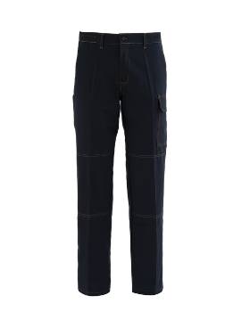 Работни панталони во растеглива памучна ткаенина, со јамки за ремен на половината и ластик на грбот, затворање со капа со патент и отворено копче, два предни џебови, заден џеб со лепенка десно затворен со копче, држач за линијар нанесен на десната нога, држач за пенкало и страничен џеб затворен со преклоп нанесен на левата нога, шевови со контрастна боја.