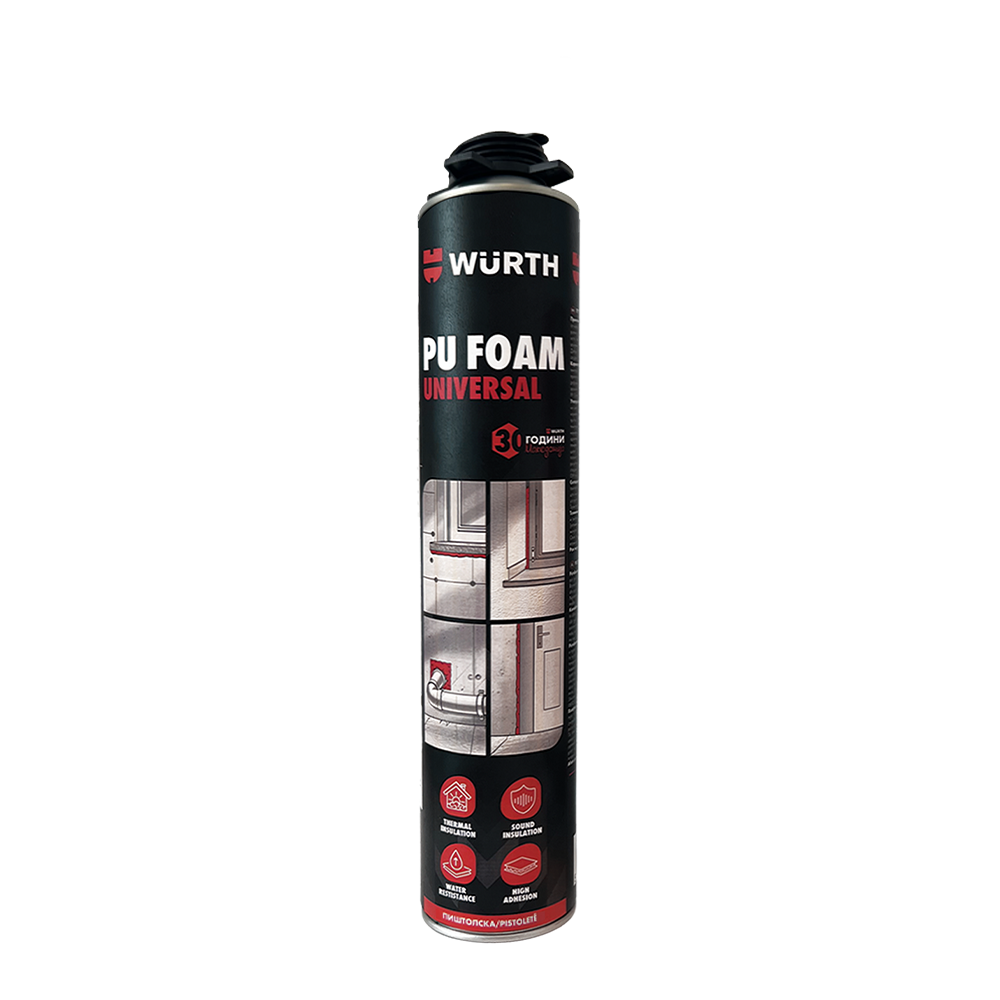 Примена: Еднокомпонентната пиштолска пур пена е наменета да се користи при монтажа на прозорци и врати, пополнување на разни видови на споеви, пополнување на отвори и пукнатини, исто така и за топлотна и звучна изолација. Го намалува влијанието на термичките мостови.Добро се прилепува на повеќето градежни материјали како што се дрво, бетон, камен, малтер, гипс, метал, ПВЦ и полистирен.