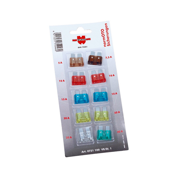 Овој комплет содржи 10 плоски осигурувачи со номинални струи од 3 до 30 ампери, дизајнирани за заштита на електричните кола во возилата од преоптоварување и кратки споеви. Различните бои на осигурувачите овозможуваат лесно препознавање на нивната номинална струја, а нивната конструкција овозможува брза и едноставна замена без потреба од специјализирани алати.