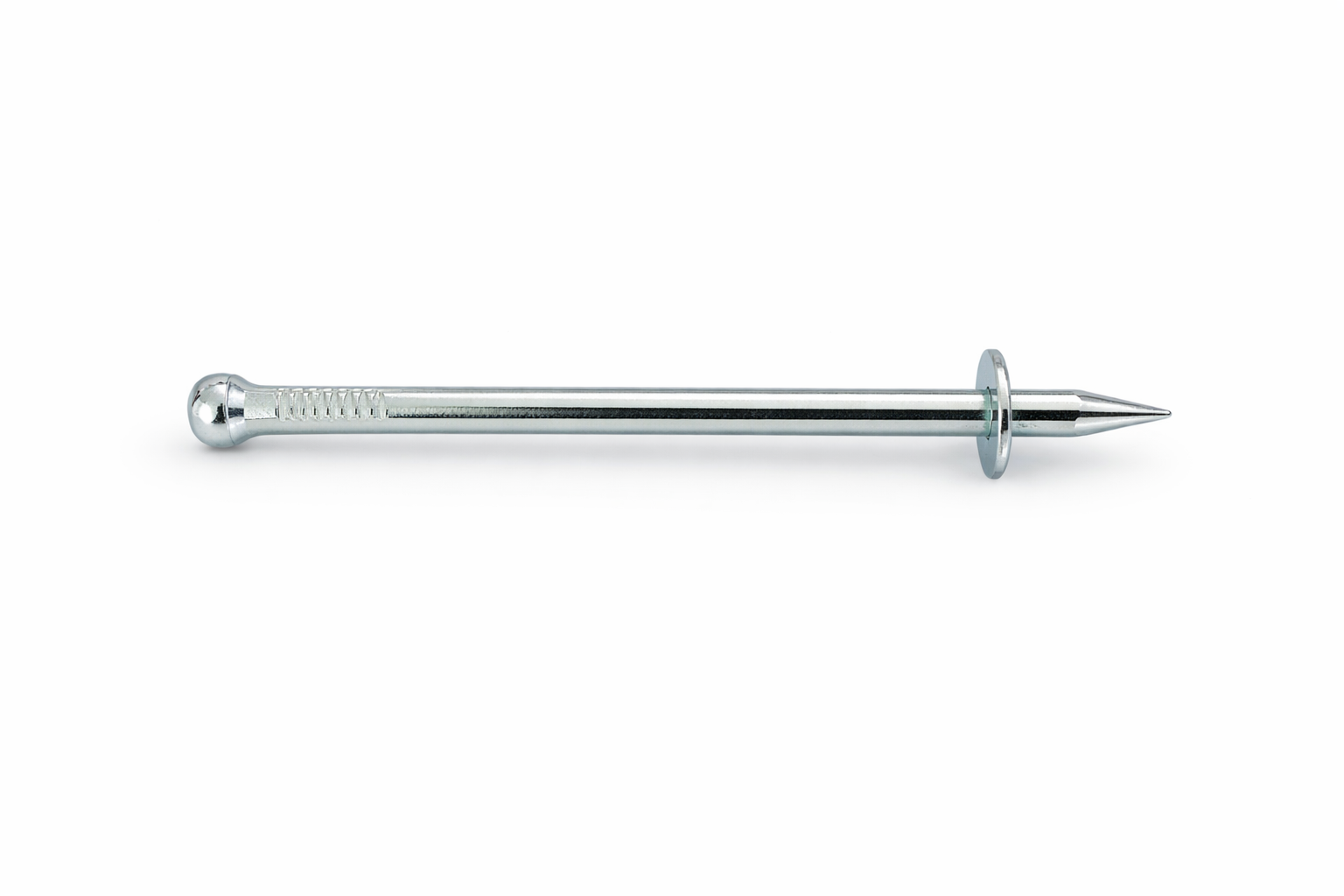 Челичен шајка со остар врв и интегрирана подлошка, дизајнирана за директно заковување (ударно монтирање) во бетон, тула или камен. Телото е мазно, со делумно профилиран сегмент за подобро прицврстување во материјалот
