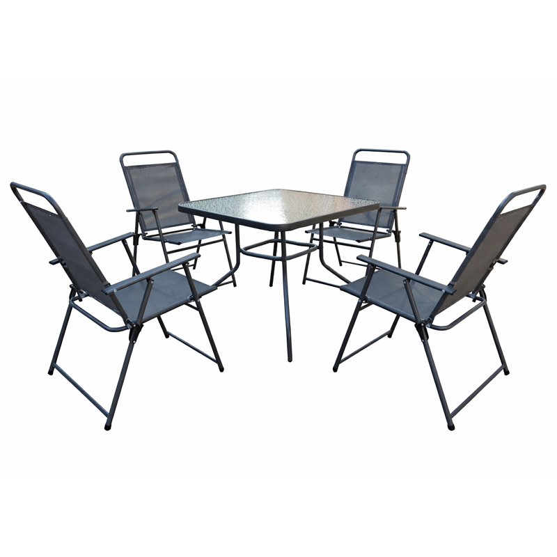Set kopshti, madhësia e tavolinës: 90*90*70cmTuba çeliku: 24*0.8mm, 5mm Xhami i printuar. 5 mm Karrige: 54*61*H90 CMTuba çeliku: 22/18*0.8 mmMaterial: tekstil (pëlhurë sintetike) 1x1
