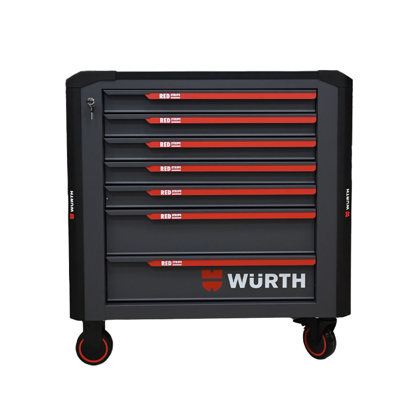 Работилничката количка RedStripe Plus 8.8 е premium мобилна работна станица со челична лакирана конструкција во сива/црна боја, димензии 823×943×568mm и носивост до 450 kg. Опремена со 7 широки фиоки на шини и 4 тркала, доаѓа целосно опремена со 324 парчиња Würth алат распоредени во 17 специјализирани сета.